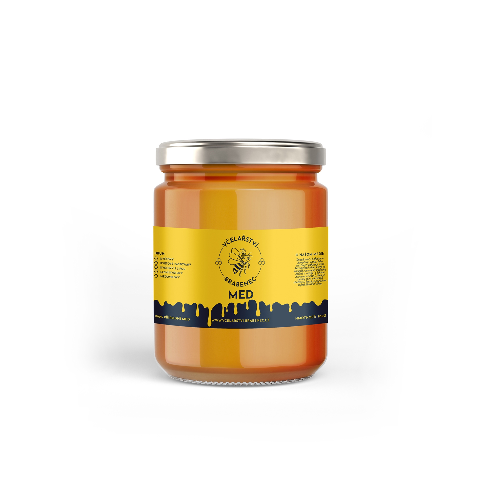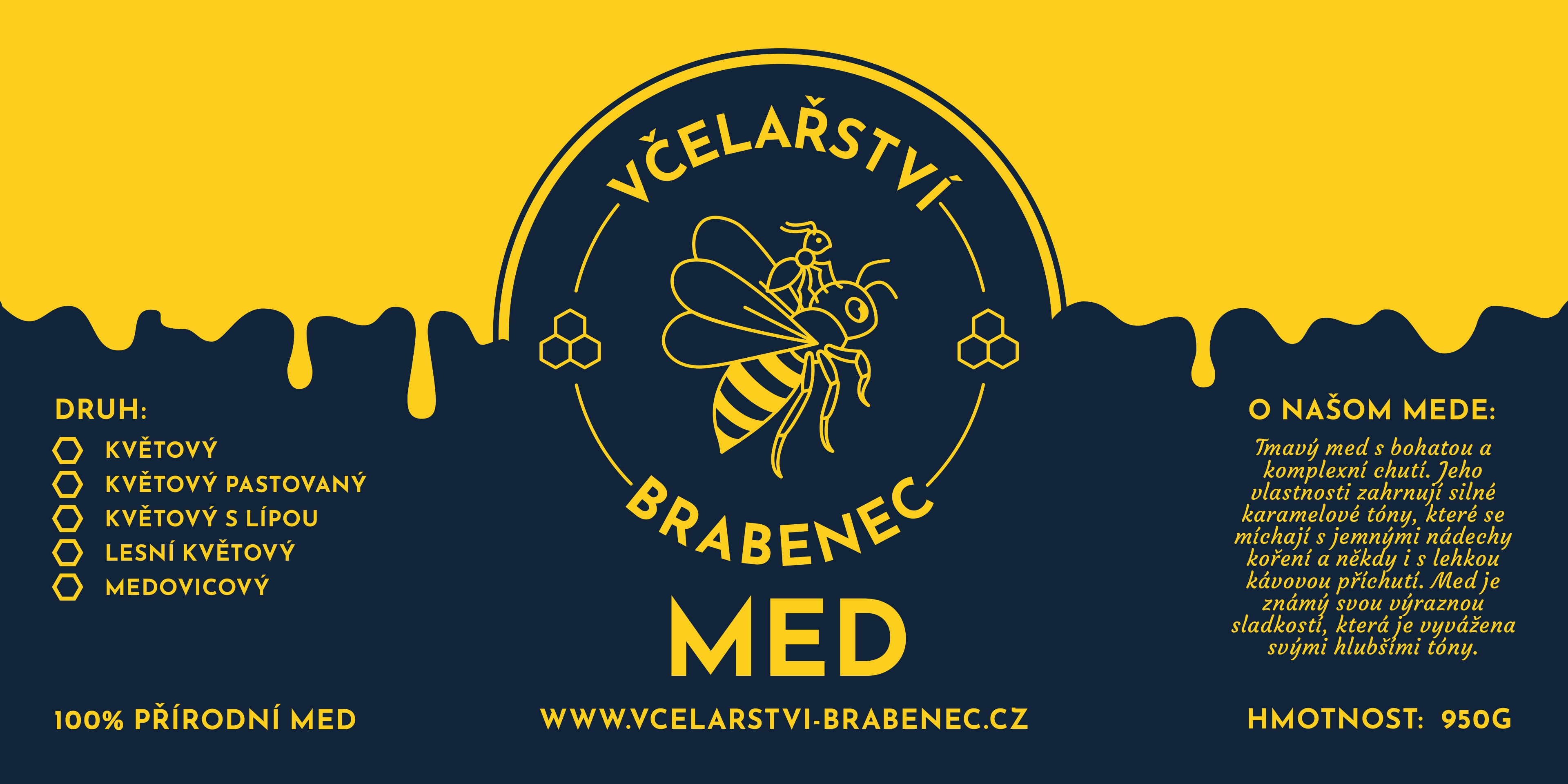 Nové logo v strede etikety vytvára silný stredobod kompozície, zatiaľ čo prehľadné rozloženie textov a dolný motív medových kvapiek dodávajú dizajnu svieži, dynamický a prémiový charakter.