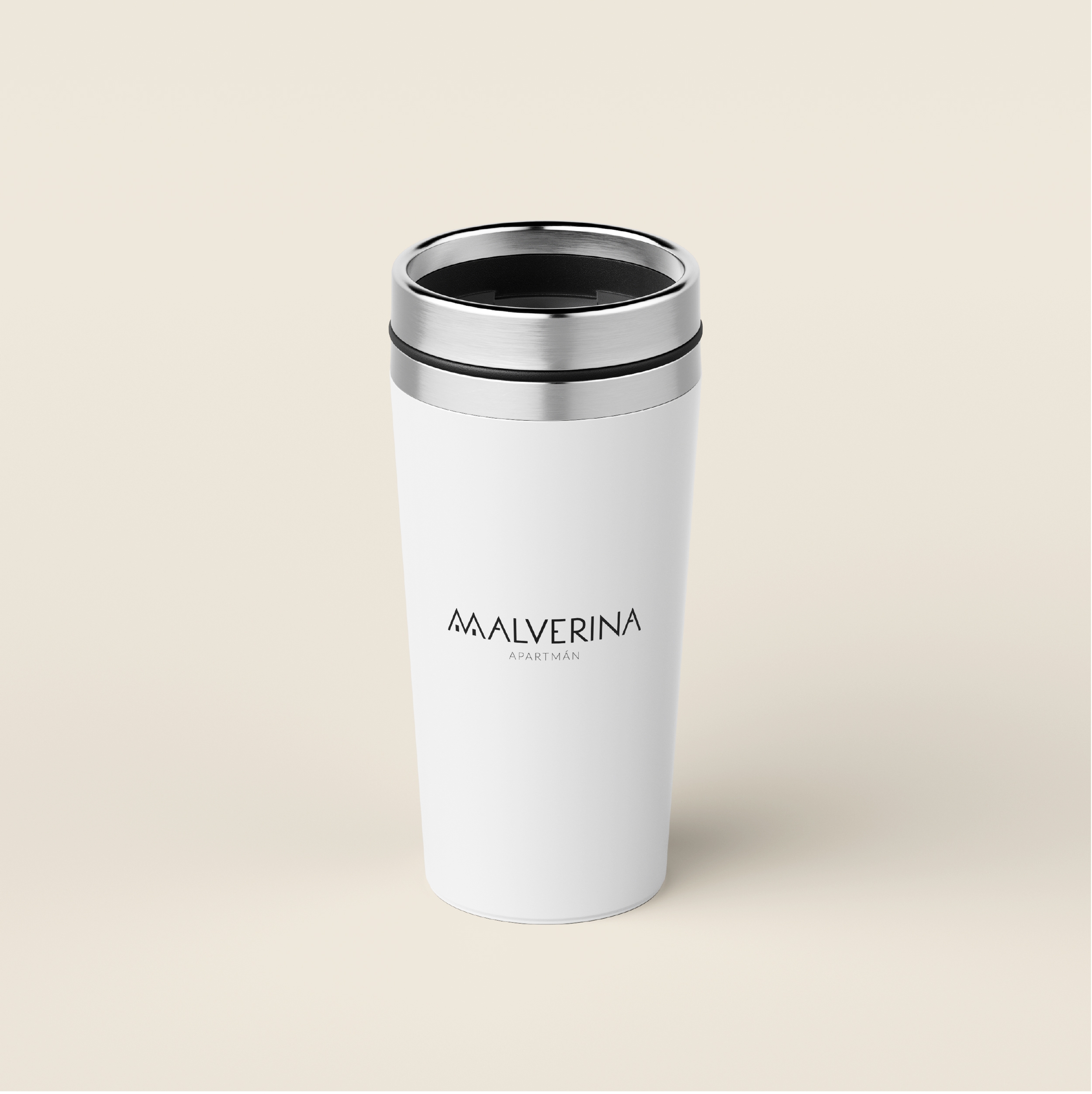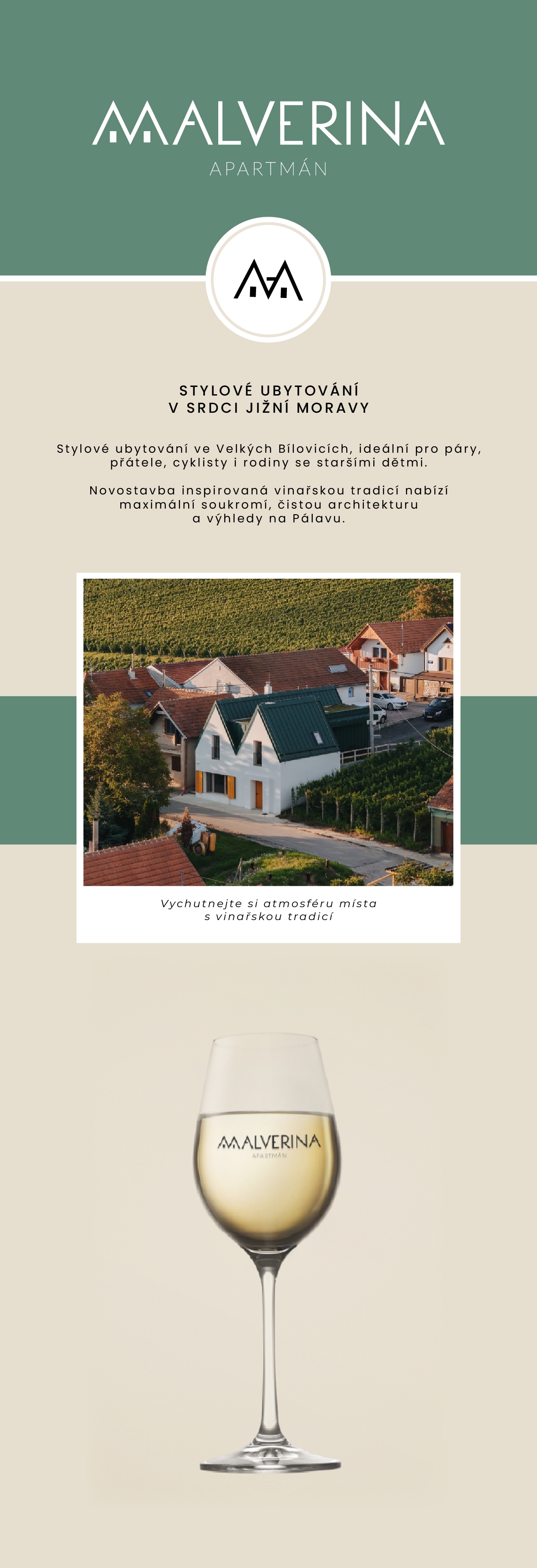 Součástí vizuální identity je také zkrácená varianta loga, tedy symbol, vycházející ze stylizovaného písmene M. V něm je doplněn drobný detail v podobě vodorovné linky z písmene A, která odkazuje jak na mezilehlou pochozí část střechy, tak na iniciály majitelky. Logo Malverina tak propojuje osobní příběh, architekturu místa i vinařskou tradici.