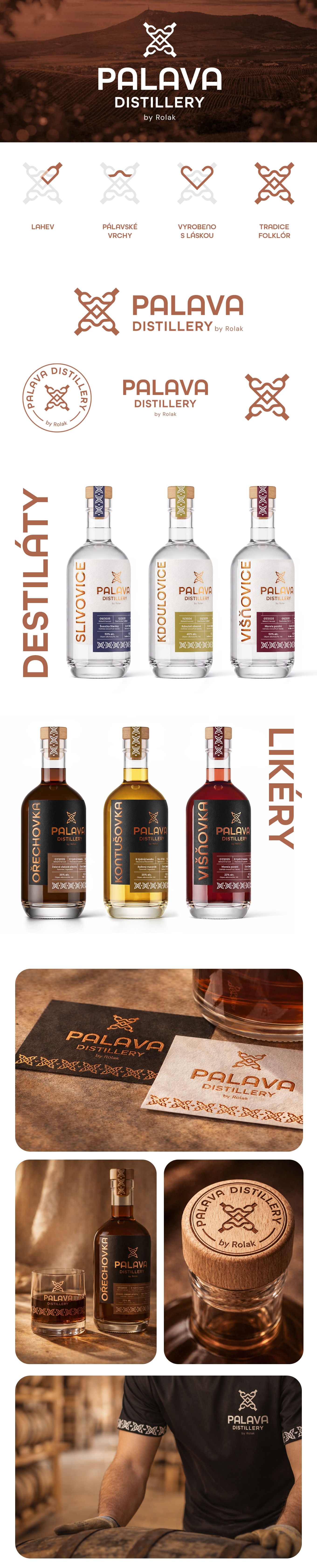 Při tvorbě loga Palava Distillery jsem se zaměřil na důraz na původ, autenticitu a lokální tradici. Inspirací mi byla samotná Pálava, regionální řemeslo a folklor. Mým cílem bylo vytvořit identitu, která bude jasně rozpoznatelná, dlouhodobě funkční a bude reprezentovat jedinečnost značky. Proč jsem se vyhnul siluetě Pálavských vrchů a dalším zmíněným symbolům Plně chápu požadavek, na to aby byl při návrhu kladen důraz na místo původu produktu. Během analýzy jsem však narazil na zásadní problém. Silueta Pálavských vrchů se objevuje v desítkách log – používají ji vinařství, penziony, turistické organizace i další lokální producenti.Stala se jedním z nejpoužívanějších symbolů spojených s Pálavou, a tedy i výrazně generickým motivem, a to jde přímo proti požadavku na odlišitelnost a prémiovost. Podobná situace nastává i u motivů jako otisk prstu nebo srdce, které jsou obecně také nadužívané. Navíc symboly složené z tenkých linek a jemných detailů často nefungují v malých velikostech (např. favicon) a špatně se reprodukují pomocí některých technologií (horká ražba, výšivka, některé tiskové techniky). Jak vznikl navrhovaný symbol pro Palava Distillery Mým cílem bylo vytvořit symbol, který bude mít silný význam, jasně reprezentovat místo původu, řemeslo, tradici a zároveň bude fungovat jako pevný stavební prvek pro celou vizuální identitu. Jednotlivé motivy ze zadání jsem proto pojal spíše symbolicky a zkombinoval do jednoho tvaru. lahev - základní motiv odkazující na destiláty stylizovaný vrchol - nenápadný, ale přítomný odkaz na region a Pálavské vrchy srdce - symbolizující lásku k řemeslu vše propojeno do symbolu připomínajícího krojovou výšivku či folklorní ornament, tedy odkaz na moravskou kulturu a tradici Styl komunikace V zadání byla zmíněna inspirace „old distillery style“. Tento styl je výrazný a zajímavý, ale vizuálně odkazuje spíše na americké nebo skotské palírny whisky. Rozhodl jsem se zachovat určitou robustnost a řemeslnost, ale zároveň jasně prezentovat, že stavíte na domácí nikoliv zahraniční tradici Preferovanou barevnost jsem doplnil o několik doplňkových barev, které umožňují lépe strukturovat produktové řady. Etikety jako důkaz funkčního vizuálního systému Nejde pouze o to vytvořit logo, ale i celý funkční vizuální systém. Proto jsem navrhl sadu etiket, na kterých je možné vidět jak logo funguje na produktech a jak lze pracovat s doplňkovými barvami pro rozlišení jednotlivých produktů. Bílé etikety jsou použity pro destiláty, podtrhují jejich čistotu a transparentnost.Tmavé etikety jsou určeny pro likéry, lépe odpovídají jejich charakteru. Barevné odlišení jednotlivých produktů pak zajišťuje rychlou orientaci zákazníka, který dokáže produkt rozpoznat na první pohled, bez nutnosti číst etiketu.