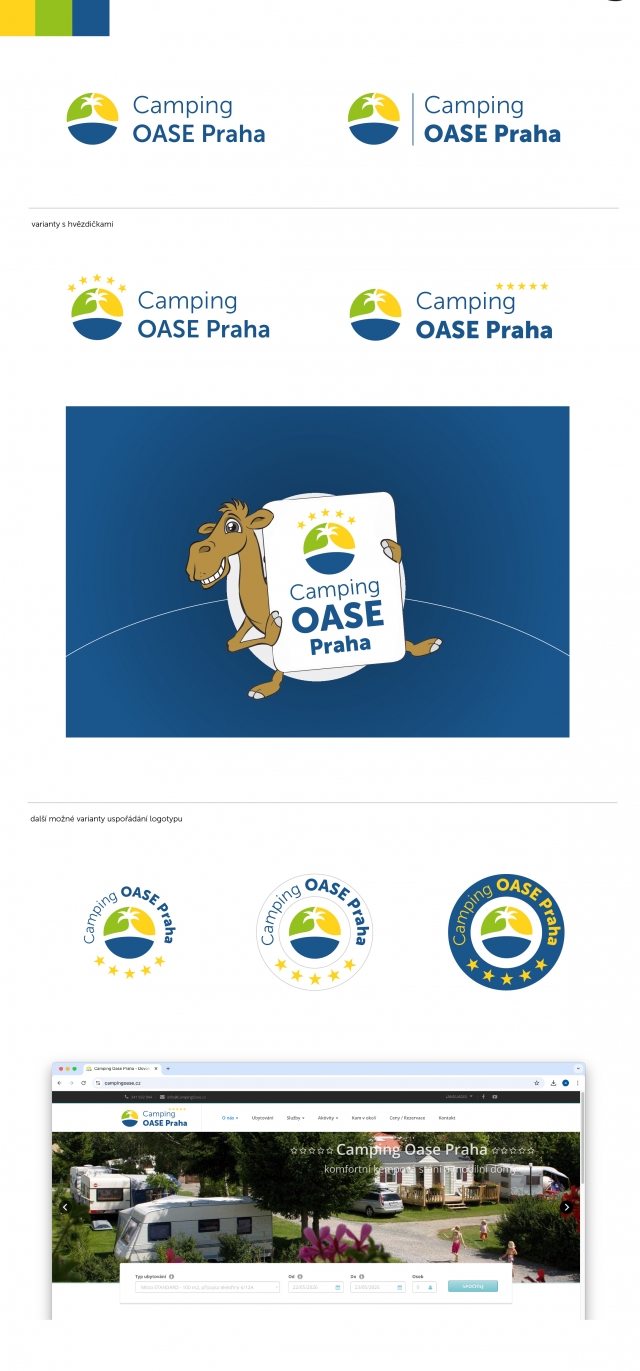 Dobrý den, Váš návrh je mezi těmi, které nás jistě oslovili. 1. Jen bychom asi rádi zkusili trochu zvýraznit - tedy aby bylo více "křiklavější" na bílém podkladu. Asi by stačilo jen úrovněmi barvy přitmavit? Necháme na Vás. 2. Pak bychom poprosili - v podpisu mailu a jiných materiálech používáme logo i jako součást s velbloudem, naším maskotem(který jej drží). Mohl byste nám ještě udělat návrh, jak by se logo, včetně názvu "Camping Oase Praha *****" dalo vizuálně umístit na místo toho původního - viz. https://www.campingoase.cz/Media/Default/2026/velbloud-s-logem-5-hvezd.pdf ? 3. v kulatém provedení budeme (používat na čipových hodinkách) doplnit se zacováním v kruhu i název, včetně 5ti hvězd: "Camping OASE Praha *****" S tím, že by ten název+hvězdy měl být dost blízko symbolu aby se na malý kruh (samolepka na čipových hodinkcáh je kruh jen 3 cm v průměru) vše vešlo 4. Na titulce našich web. stránek pak poprosíme též zvýraznit i ten název a dopnit o 5 hvězd