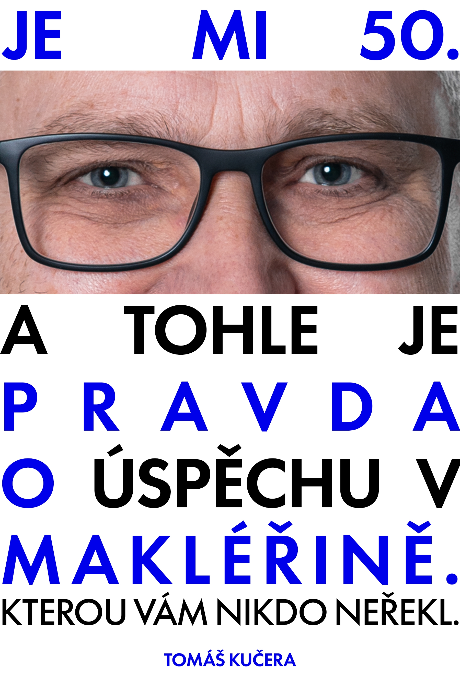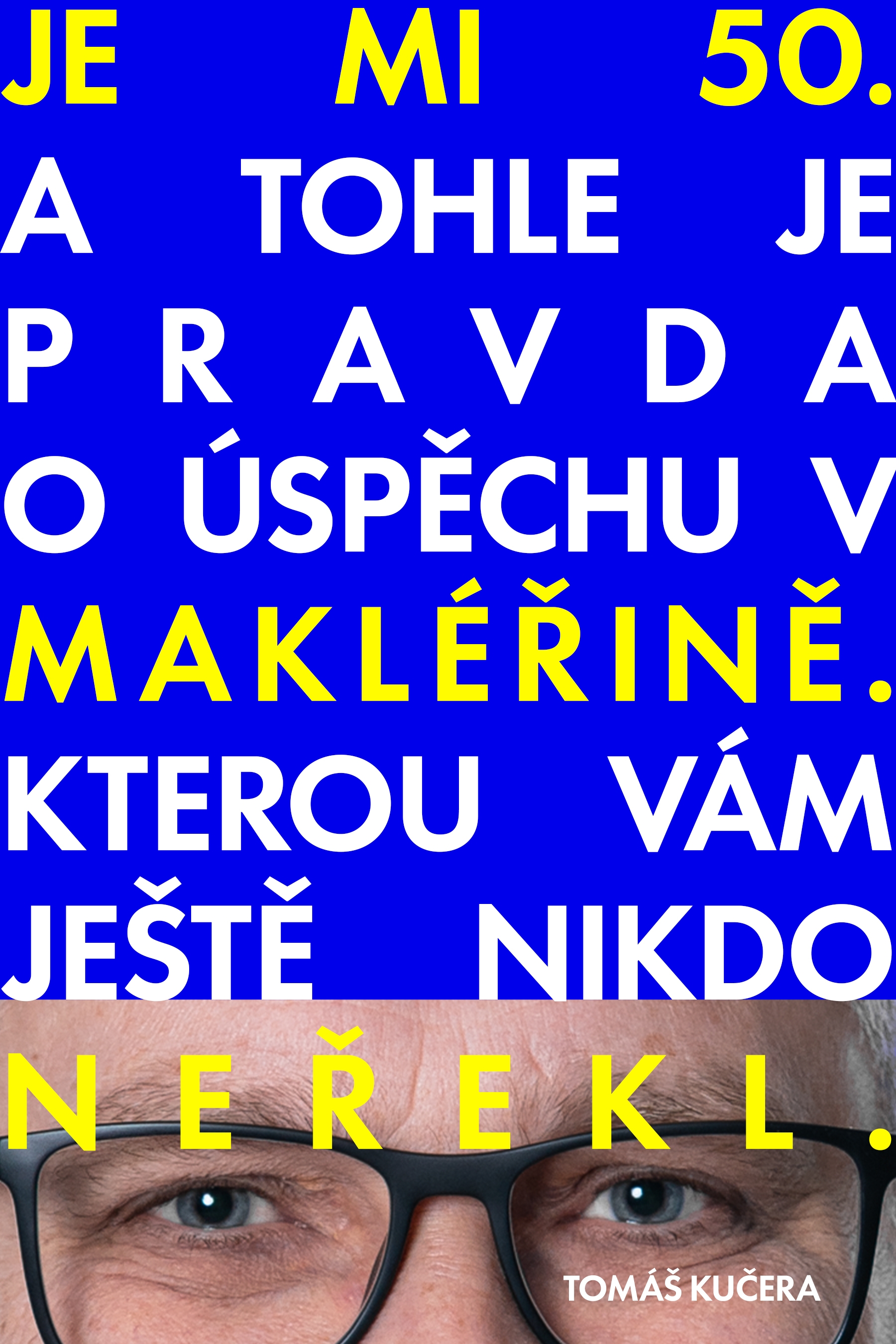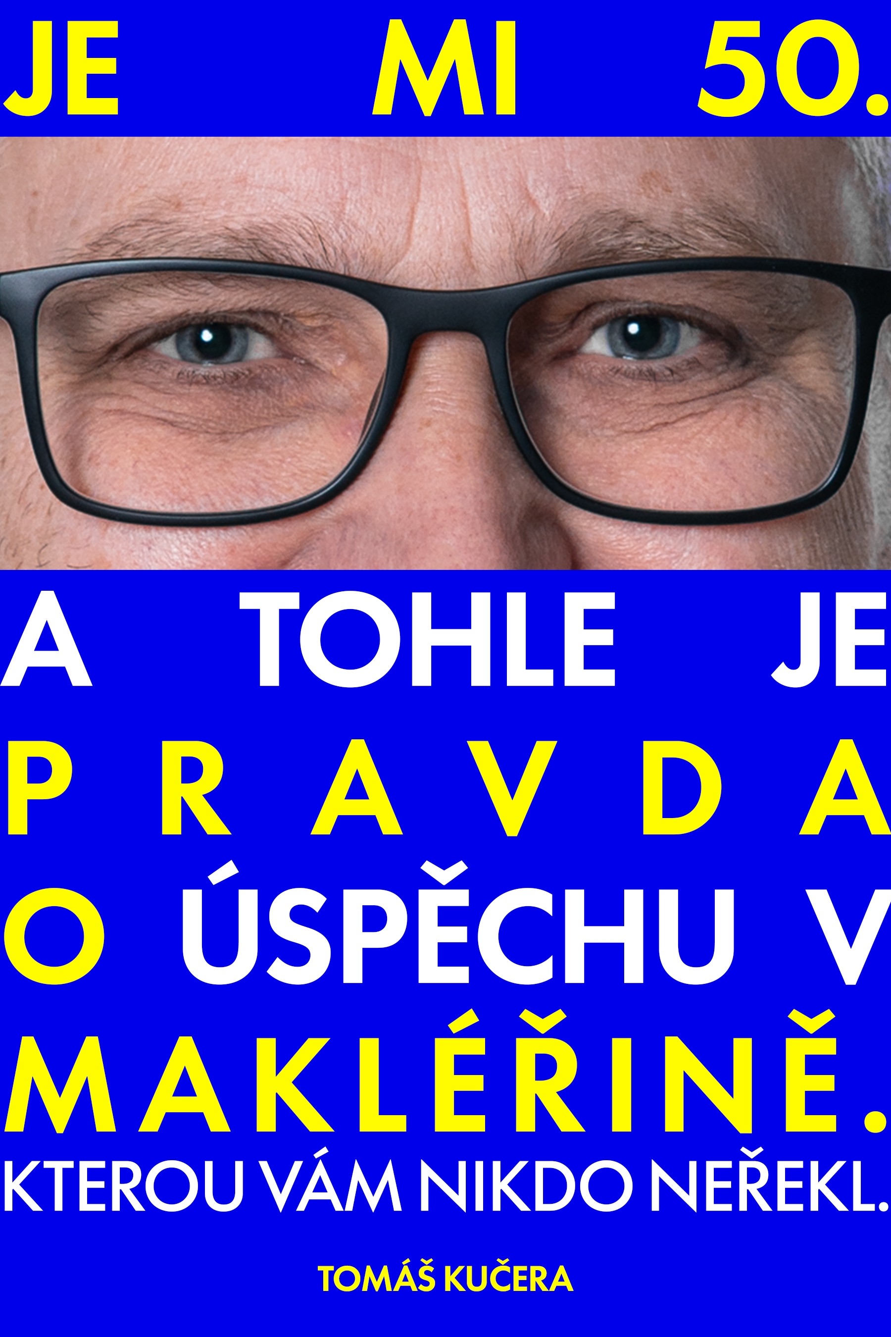 Dobrý den. Moc se mi líbí váš návrh. Můžeme jej maličko doladit? Ubral jsem jedno slovo, aby mohla být písmena větší. A zároveň jsem to druhé sdělení změnšil, je to dovětek, který nění tak důležitý. A některá slova jsem ještě barevně odlišil. Mohl bych požádat o úpravu viz níže? Případně zkuste nakombinovat i jiné barvy než modrou a žlutou. Ale samozřejmě takové, aby byly kontrastní a výrazné. Moc děkuji. JE MI 50. (OČI)PRAVDAO ÚSPĚCHU VMAKLÉŘINĚ.KTEROU VÁM NIKDO NEŘEKL.