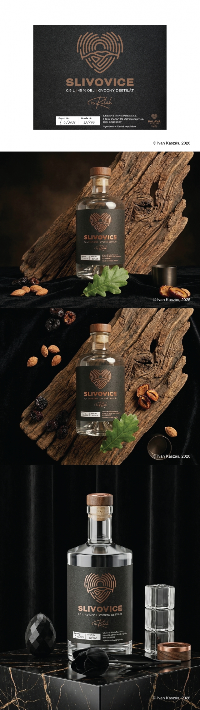 Zušľachtenie: Dominantné logo a nápis „Slivovice“ sú navrhnuté pre medenú ražbu (hot stamping). Táto voľba priamo odkazuje na medené destilačné kolóny a dodáva etikete hĺbku pri lome svetla.